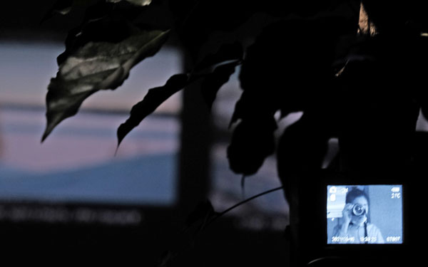 ‘Neither Here nor There’ is a video installation created by two artists who live in different time zones. The distance between Taiwan and the United States is approximately 12208km, the time difference is about 13 hours, and the temperature difference is around 20 degrees. The two projectors keep moving back and forth between both walls, and the images of subtropical and coniferous forests get blurry/clear when one approaches/leaves.