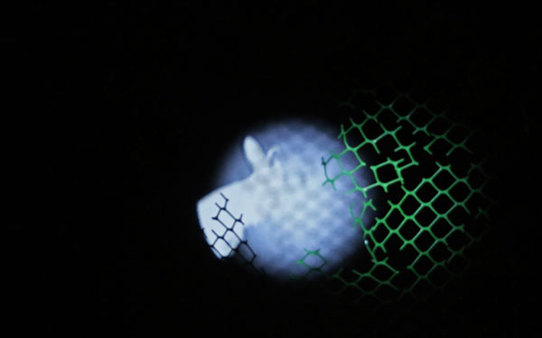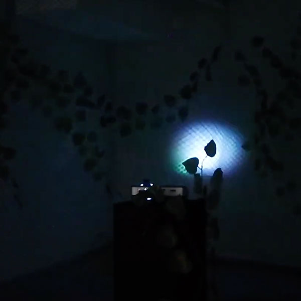 The projector keeps rotating back and forth like a flashlight in the center of the space, and the image forms a blurry silhouette on the wall by penetrating through the plastic net and vines. The bunny being constantly chased by the unpredictable light, forming an interactive relationship between the virtual image and the actual installation.